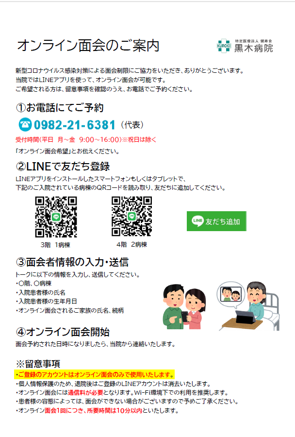 LINEアプリを使用したオンライン面会ができます。